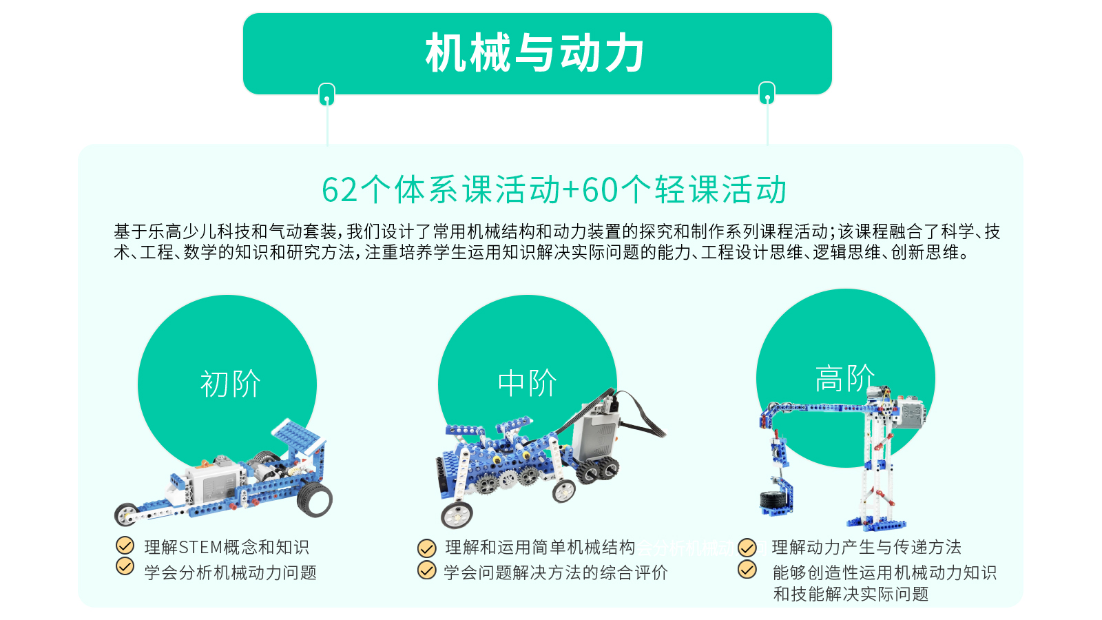 我们率先提出“物理世界,学用编程”的机器人教育理念,强调软硬件相结合,而且我们将努力发展线上线下融合的方式,让孩子学编程,用编程,解决物理世界的真实问题。我们提供由中科大港大硅谷精英团队研发、在沪上知名机器人编程教培成功实施近10年的3-16岁全套机器人编程教育加盟课程,课程目标设置明确,课程规划体系合理,课程活动资源丰富并保持动态更新。