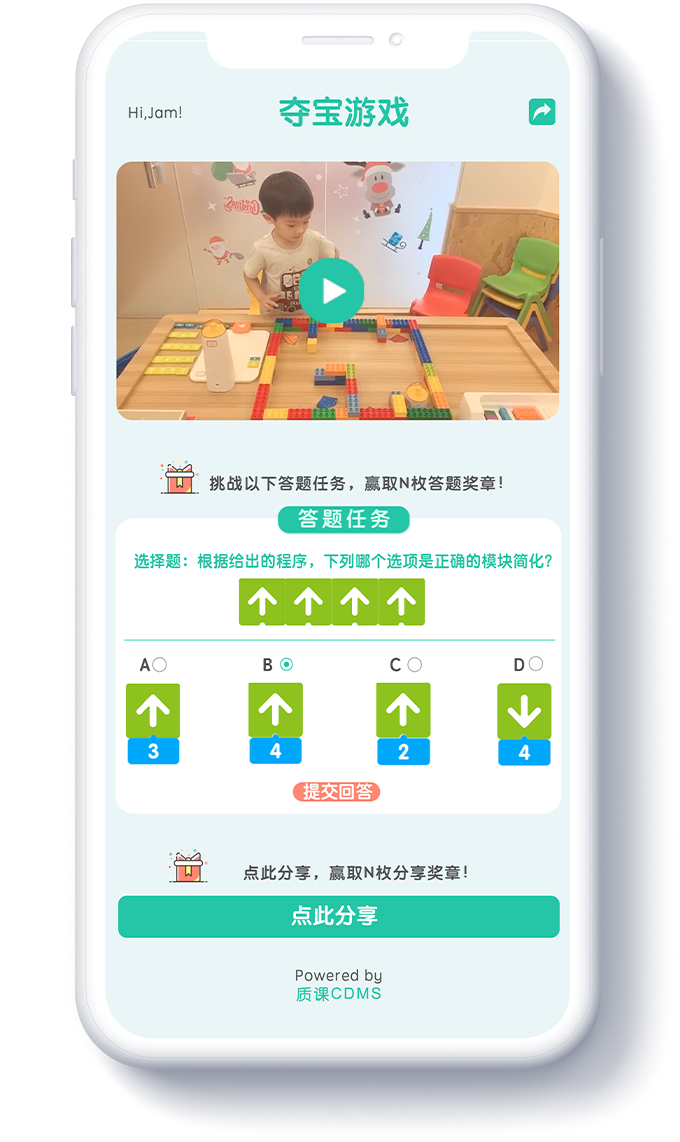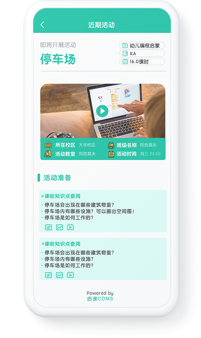 「质课CDMS」,帮助广大机器人教育机构摆脱课程资源无法集中管理和持续改进、教师流动导致教学服务中断、课程和教学质量难以把控等巨大困扰,不仅承载了儿童和青少年机器人教育完整的课程体系和丰富的教学资源,还提供了支持线上线下融合运营所需要的课前课中课后服务标准化和自动化管理功能。