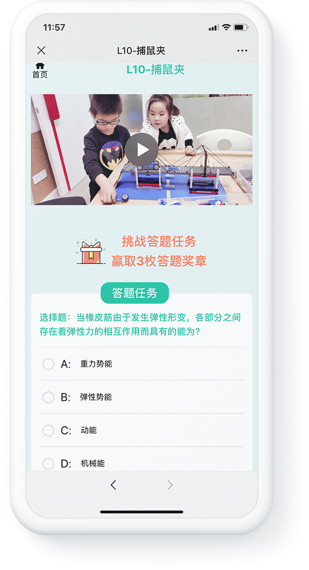 精选并精心制作了400+在家学机器人建构和编程的短视频轻课,分为原理课与实践课,原理课夯实理论基础,实践课演示搭建过程,轻松引导小朋友随时随地完成搭建挑战,同时设置答题任务检测学习效果。
