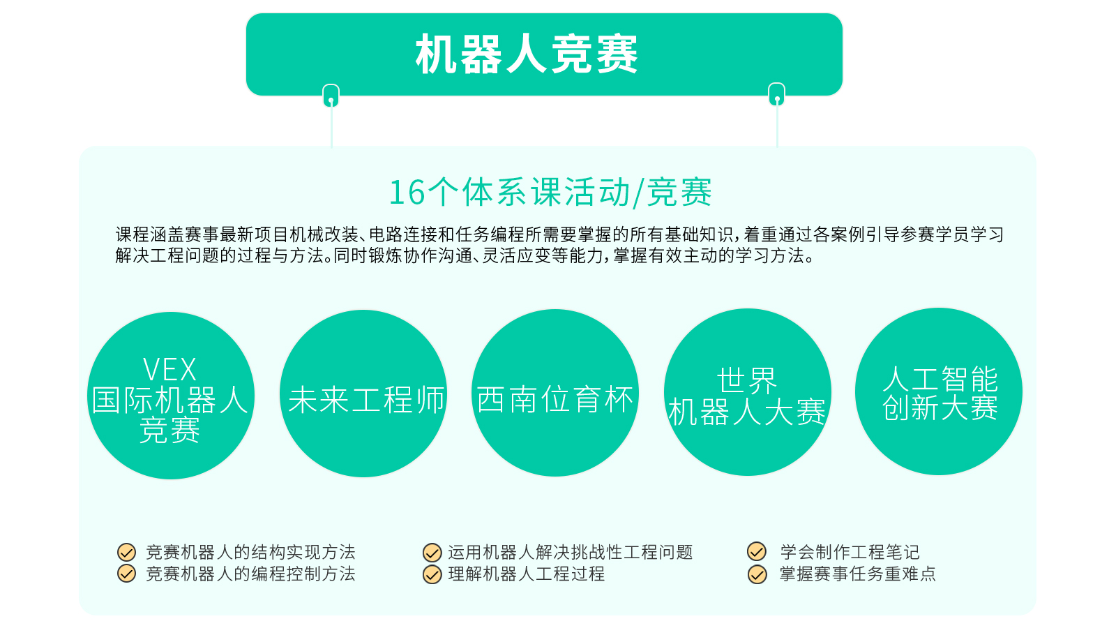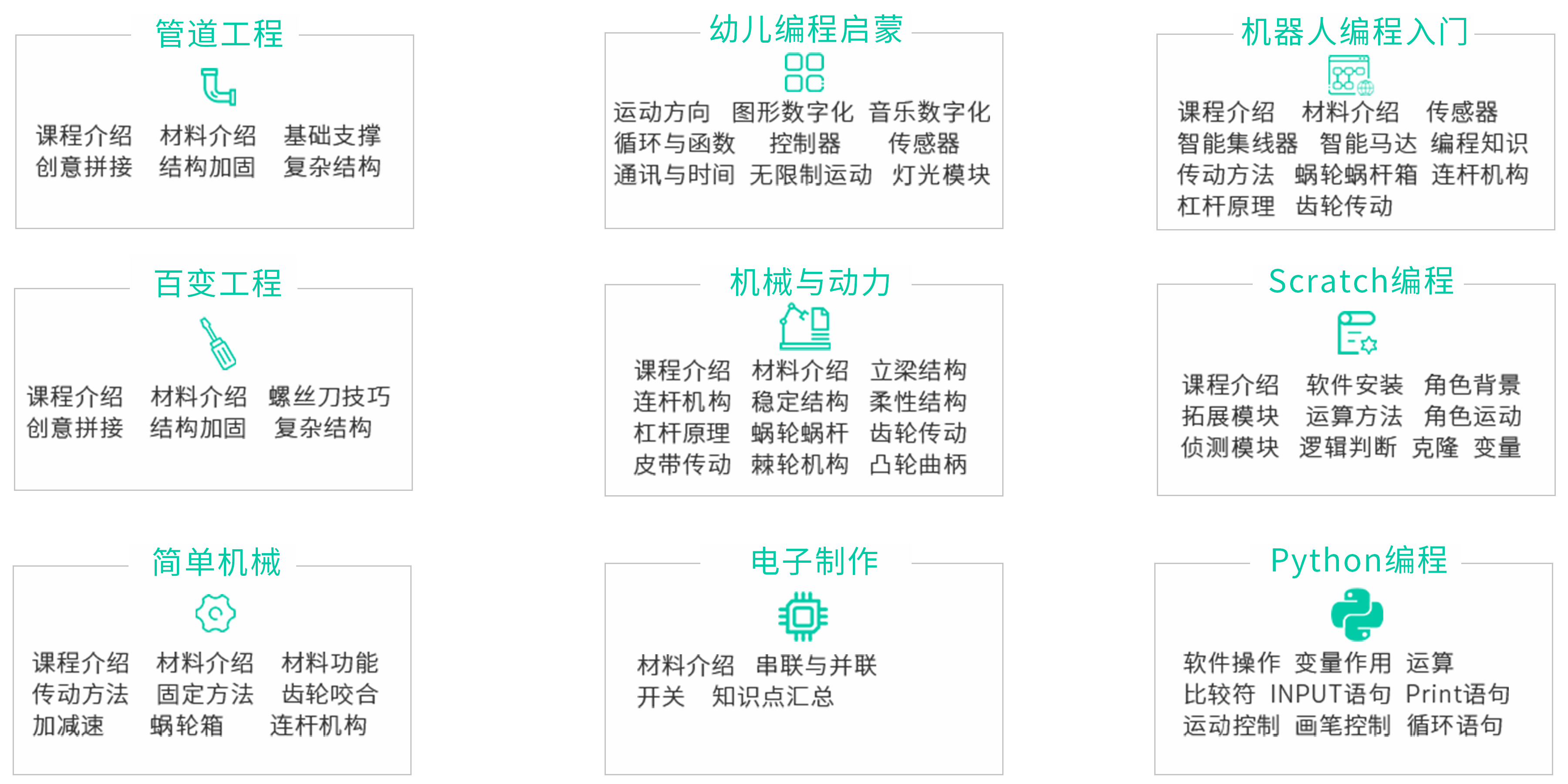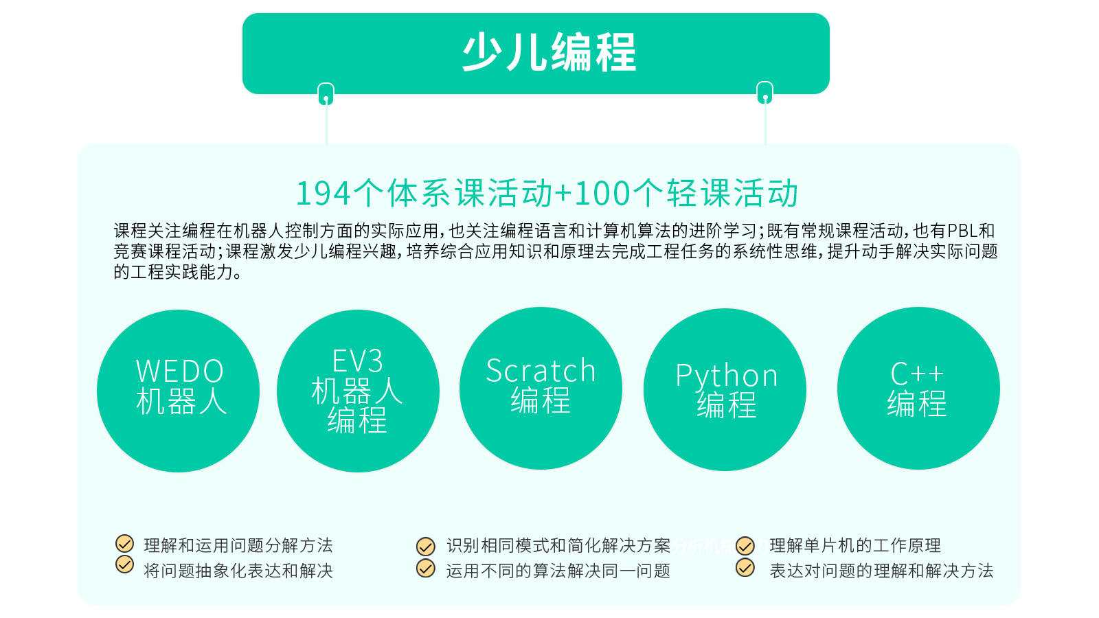 我们率先提出“物理世界,学用编程”的机器人教育理念,强调软硬件相结合,而且我们将努力发展线上线下融合的方式,让孩子学编程,用编程,解决物理世界的真实问题。我们提供由中科大港大硅谷精英团队研发、在沪上知名机器人编程教培成功实施近10年的3-16岁全套机器人编程教育加盟课程,课程目标设置明确,课程规划体系合理,课程活动资源丰富并保持动态更新。